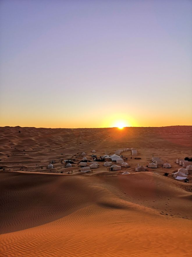 Ich bin eine Düne hochgewandert, barfuß. Der kühle und orange Sand zwischen den Zehen war samtig weich. Die Sonne am Weg auf die andere Seite der Welt und schon fast untergegangen. Das Licht war fast golden. Ich setzte mich da oben also hin und sah runter aufs Camp. Die Zelte bildeten ein kleines Dorf, eins sah aus wie das andere. Es war unglaublich still. Dann richtete ich den Blick in die Ferne und da war es wieder: mein Wüstengefühl. Die Leere um mich herum hat die Leere in mir ausgefüllt. Fragen, die mich fast das ganze letzte Jahr beschäftigt haben („Warum?“ war die häufigste darunter), sind unbeantwortet verstummt.